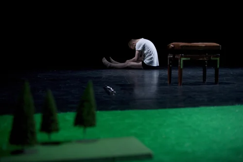 Drawing from surrealist pictorial ideas and mythological suggestions of transformation and otherworldliness, this solo for Theo Clinkard, explores a territory where events, scale and time take incongruous, dreamlike qualities. At-any-moment-something-else premiered at Woking Dance Festival in March 2010.